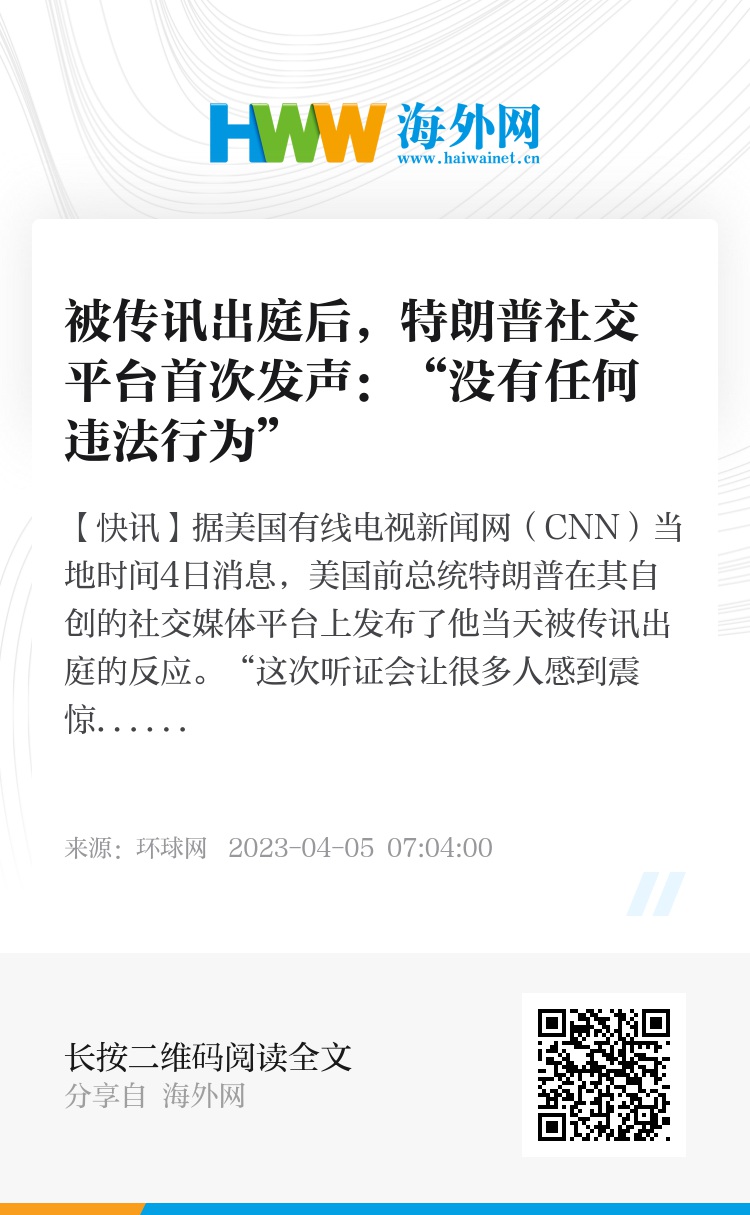 【环球网快讯】据美国有线电视新闻网(CNN)当地时间4日消息,美国前总统特朗普在其自创的社交媒体平台上发布了他当天被传讯出庭的反应。