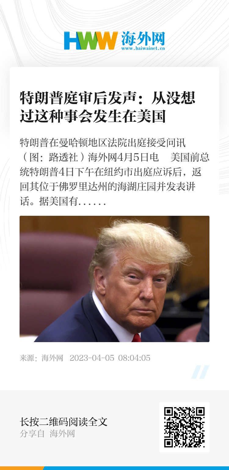 海外网4月5日电 美国前总统特朗普4日下午在纽约市出庭应诉后,返回其位于佛罗里达州的海湖庄园并发表讲话。据美国有线电视新闻网报道,特朗普讲话时表示,从没想过这种事会发生在美国。
