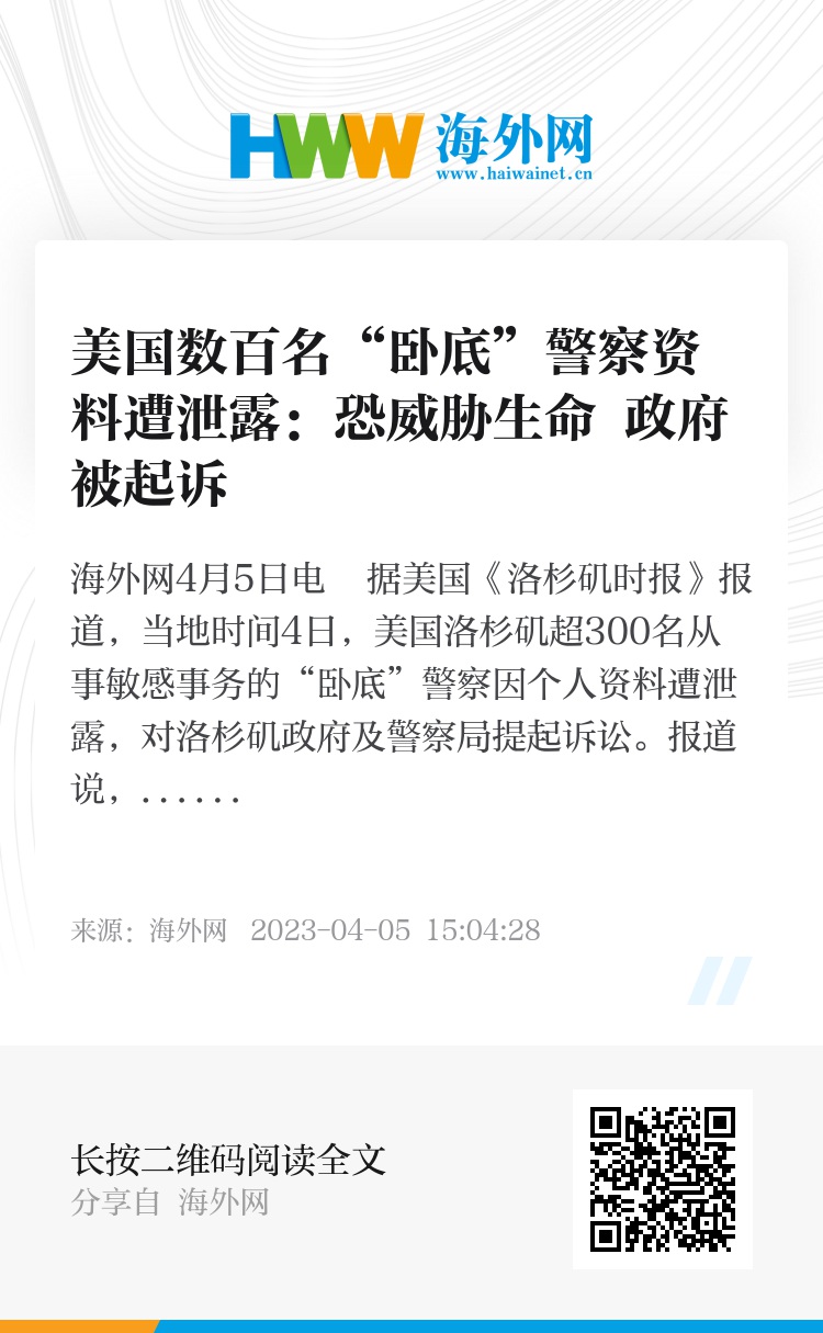 海外网4月5日电 据美国《洛杉矶时报》报道,当地时间4日,美国洛杉矶超300名从事敏感事务的“卧底”警察因个人资料遭泄露,对洛杉矶政府及警察局提起诉讼。