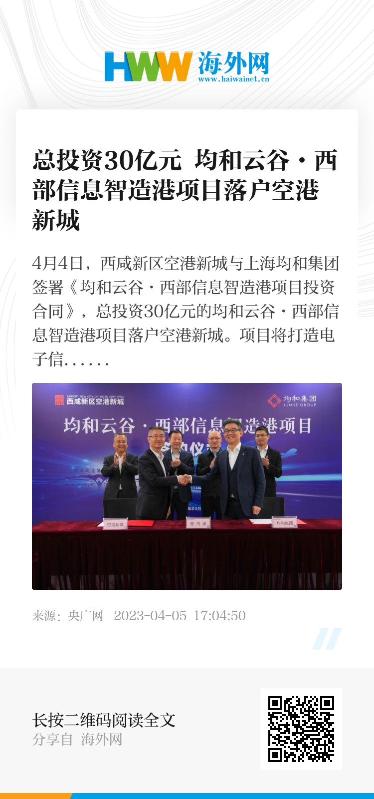 4月4日,西咸新区空港新城与上海均和集团签署《均和云谷·西部信息智造港项目投资合同》,总投资30亿元的均和云谷·西部信息智造港项目落户空港新城。项目将打造电子信息产业专业园区,进一步壮大空港新城电子信息产业集群。