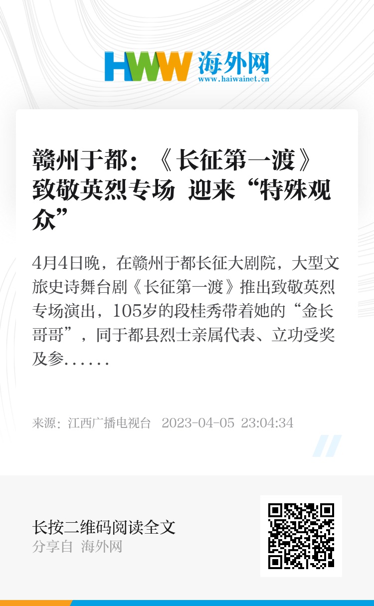 4月4日晚,在赣州于都长征大剧院,大型文旅史诗舞台剧《长征第一渡》推出致敬英烈专场演出,105岁的段桂秀带着她的“金长哥哥”,同于都县烈士亲属代表、立功受奖及参战退役军人代表一同观看演出。