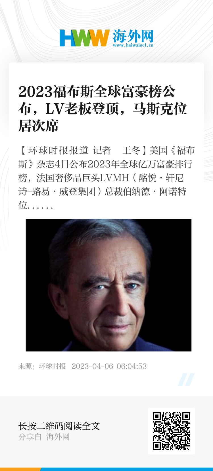 【环球时报报道 记者 王冬】美国《福布斯》杂志4日公布2023年全球亿万富豪排行榜,法国奢侈品巨头LVMH(酩悦·轩尼诗-路易·威登集团)总裁伯纳德·阿诺特位居榜首。两周前发布的“2023胡润全球富豪榜”,阿诺特也是世界首富。在全球经济不景气的背景下,法国奢侈品巨头登顶全球首富,让外界颇为关注。