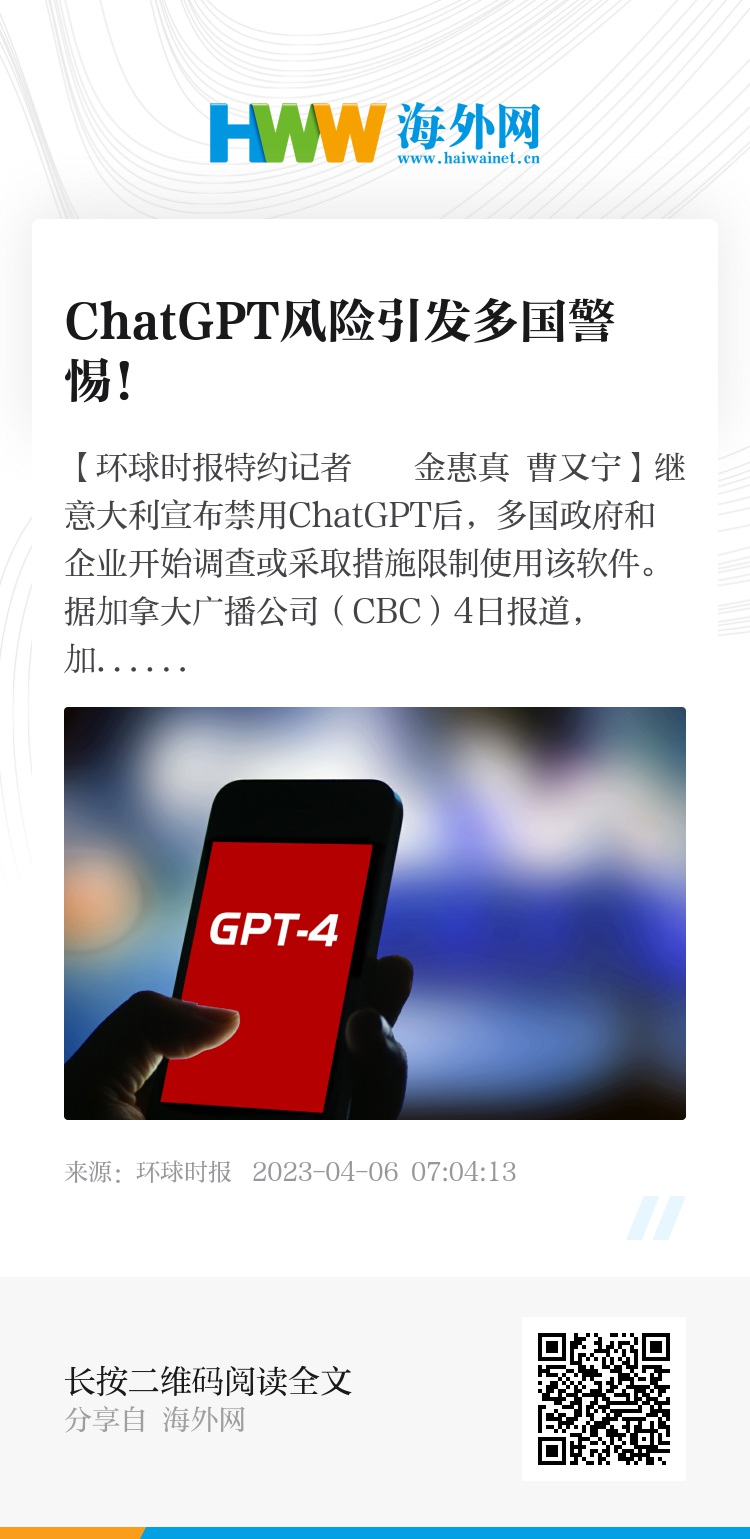 【环球时报特约记者 金惠真 曹又宁】继意大利宣布禁用ChatGPT后,多国政府和企业开始调查或采取措施限制使用该软件。据加拿大广播公司(CBC)4日报道,加拿大联邦隐私监管机构宣布,已经对开发ChatGPT的美国公司OpenAI展开调查,因为该公司涉嫌“未经同意收集、使用和披露个人信息”。报道同时提到,美国总统拜登及其科技顾问委员会在4日举行的会议上也讨论了人工智能的“风险和机遇”。英国《卫报》4日称,英国信息专员办公室已经向科技公司发出警告,不要使用个人信息来开发聊天机器人。英国信息专员办公室技术和创新总监阿尔蒙德表示,类似ChatGPT的生成式人工智能“如果被不负责任地使用,有可能对数据隐私构成风险”。