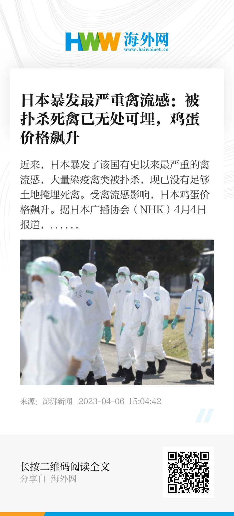 近来,日本暴发了该国有史以来最严重的禽流感,大量染疫禽类被扑杀,现已没有足够土地掩埋死禽。受禽流感影响,日本鸡蛋价格飙升。