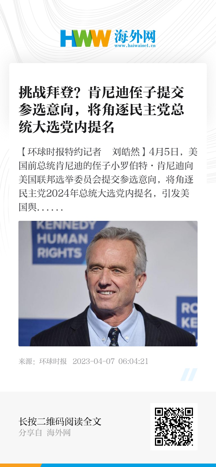 【环球时报特约记者 刘皓然】4月5日,美国前总统肯尼迪的侄子小罗伯特·肯尼迪向美国联邦选举委员会提交参选意向,将角逐民主党2024年总统大选党内提名,引发美国舆论高度关注。身为美国知名政治世家的后代,小罗伯特近年来的口碑却有些糟糕:新冠疫情期间大肆散播疫苗有害论,甚至连亲属都发公开信与他“划清界限”。在美国媒体看来,他的最新政治动向更像是个人炒作,几乎没有获得提名的可能性。