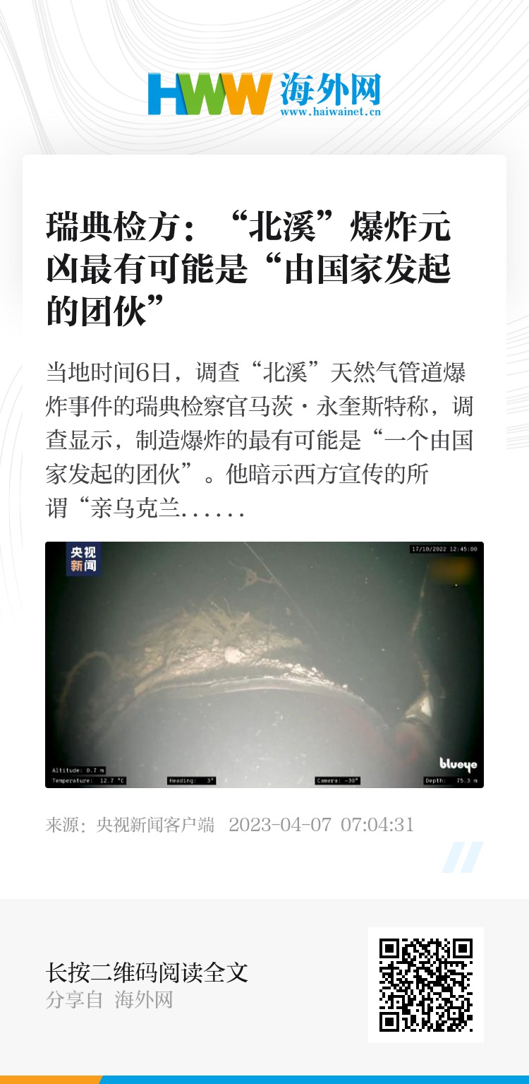 瑞典检察官马茨·永奎斯特6日表示,调查人员不排除任何可能性,但考虑到目前的情况,一个国家行为体直接或至少间接地支持了这一切。“北溪”爆炸事件中使用的爆炸物并不常见,调查人员已确定其类型,从这一点就可以排除不少嫌疑人。考虑到调查正在继续,这名检察官没有公开爆炸物的具体类型。