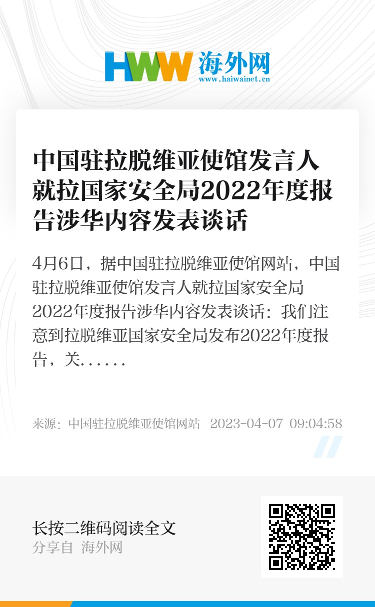 4月6日,据中国驻拉脱维亚使馆网站,中国驻拉脱维亚使馆发言人就拉国家安全局2022年度报告涉华内容发表谈话: