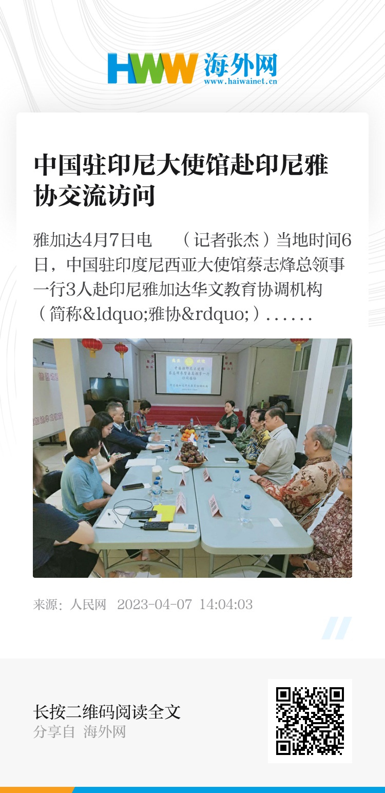人民网雅加达4月7日电 (记者张杰)当地时间6日,中国驻印度尼西亚大使馆蔡志烽总领事一行3人赴印尼雅加达华文教育协调机构(简称“雅协”)交流访问并慰问各位老师。雅协辅导委员会委员及各位雅协老师对使馆访问团的到来表示热烈欢迎,并对多年来使馆领侨处在各个方面给予本机构的热心支持表示真诚感谢。特别是疫情期间,共克时艰,帮助本机构和学校渡过了最困难的时刻。