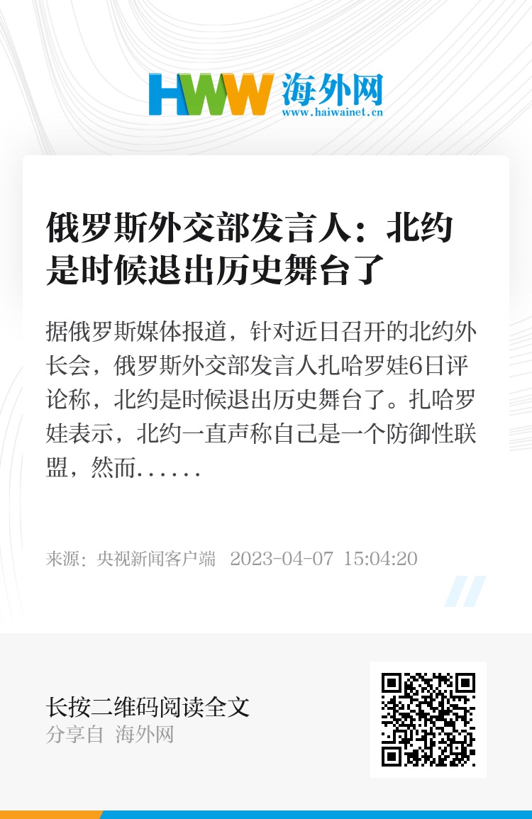 据俄罗斯媒体报道,针对近日召开的北约外长会,俄罗斯外交部发言人扎哈罗娃6日评论称,北约是时候退出历史舞台了。