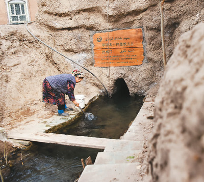 在亚尔镇,居民在一处坎儿井出水口取水。
