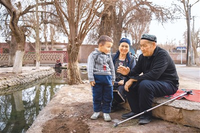 在吐鲁番市高昌区恰特喀勒乡拜什巴拉坎儿孜村,73岁的老人斯肯旦·卡德尔(右)给孙子讲述着自己小时候修坎儿井的故事。