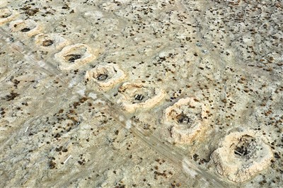 位于高昌区葡萄镇戈壁滩上的坎儿井竖井景观。