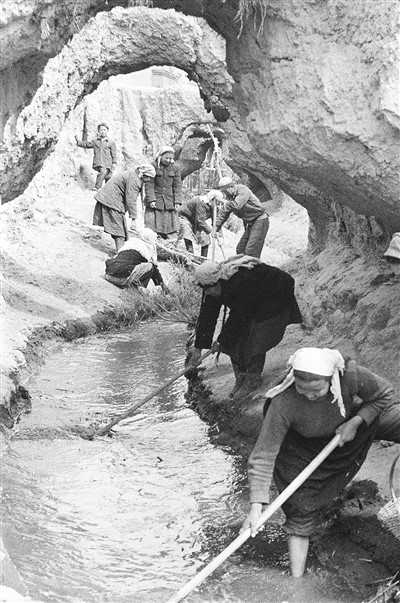 1963年,新疆吐鲁番群众在整修坎儿井渠道。