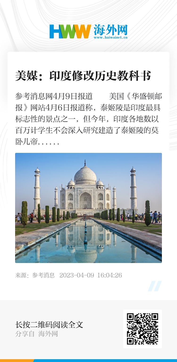 参考消息网4月9日报道 美国《华盛顿邮报》网站4月6日报道称,泰姬陵是印度最具标志性的景点之一,但今年,印度各地数以百万计学生不会深入研究建造了泰姬陵的莫卧儿帝国。