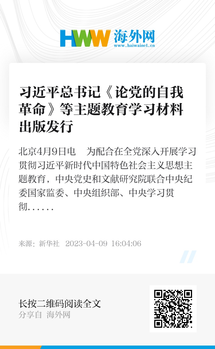 新华社北京4月9日电 为配合在全党深入开展学习贯彻习近平新时代中国特色社会主义思想主题教育,中央党史和文献研究院联合中央纪委国家监委、中央组织部、中央学习贯彻习近平新时代中国特色社会主义思想主题教育领导小组办公室分别编辑了习近平总书记《论党的自我革命》、《习近平新时代中国特色社会主义思想的世界观和方法论专题摘编》、《习近平关于调查研究论述摘编》等3种学习材料,已正式出版,即日起在全国发行。