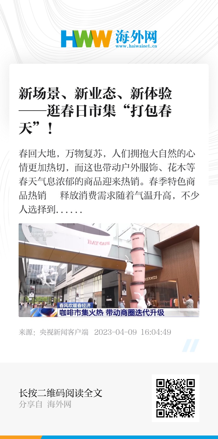 融合美食和美景,打造新消费场景。在上海的一处商场,周边的上百棵樱花树竞相绽放。以花为媒,商场在门口开设樱花市集。在花雨中漫步的独特体验,吸引了众多消费者前来打卡。