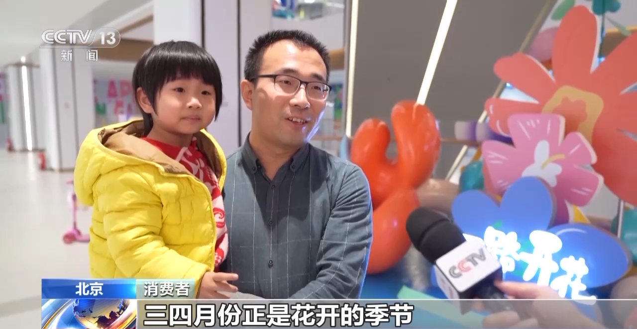 总台央视记者 徐宁宁:我现在来到了北京一家商场,中庭安装了三组超大艺术花朵装置,整个商场也利用花朵元素进行了装扮,春的气息扑面而来,吸引消费者在这里打卡拍照。