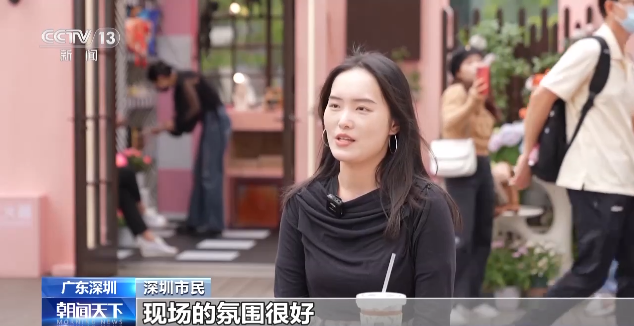 深圳市民:氛围很好,有我很喜欢的这个兔子的装置,现场的店是粉粉的、很可爱的,就很戳我的少女心。我其实平常也非常喜欢喝咖啡,今天也买了一杯,我来了市集之后一般就会跟我的姐妹们一起去购物、逛街。