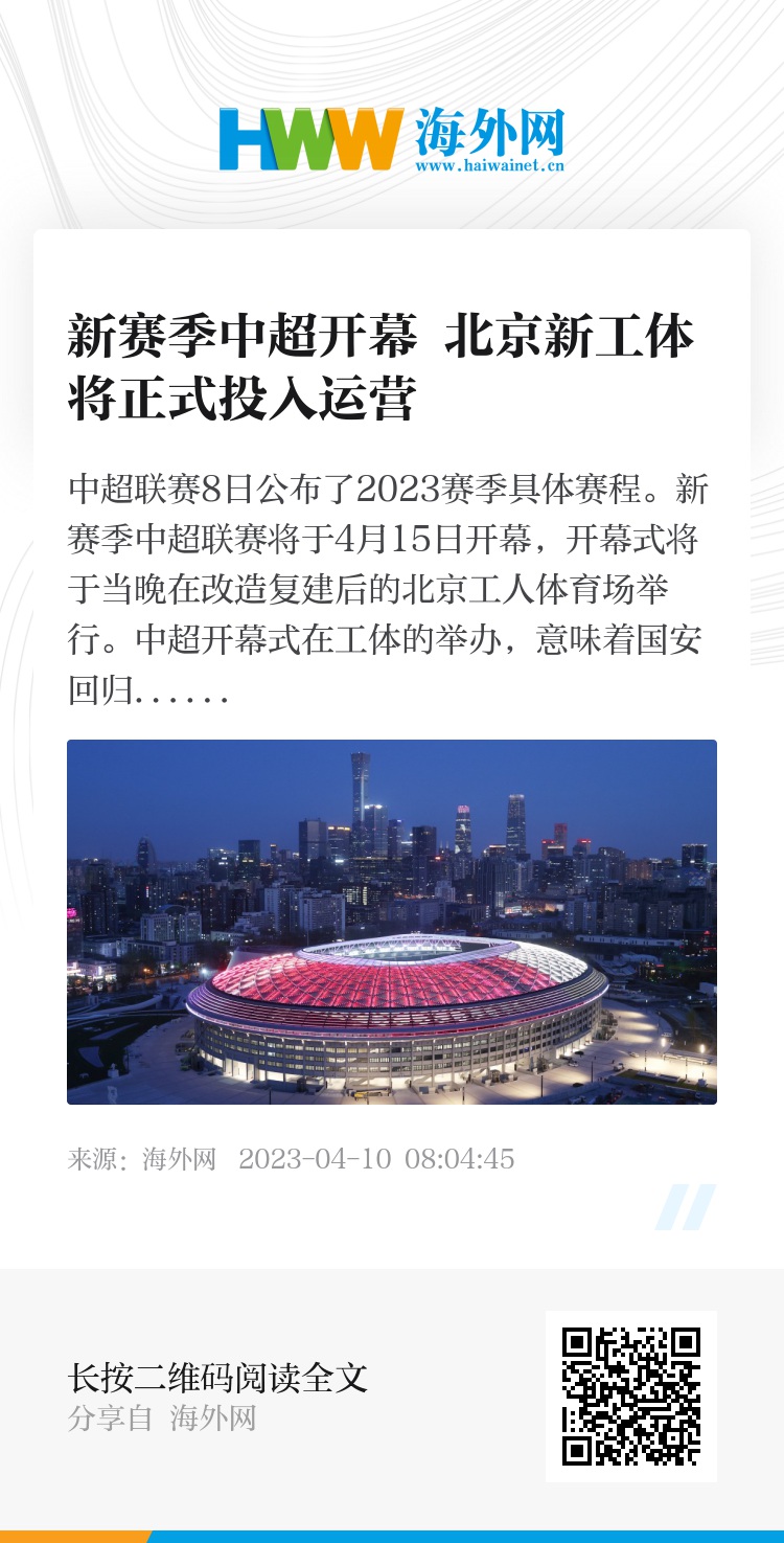 中超联赛8日公布了2023赛季具体赛程。新赛季中超联赛将于4月15日开幕,开幕式将于当晚在改造复建后的北京工人体育场举行。中超开幕式在工体的举办,意味着国安回归工体主持,也意味着工体改造复建完成后,正式投入使用。首个比赛日,大连人对阵南通支云、武汉三镇对阵上海海港、浙江队对阵长春亚泰三场比赛将在19:35同时打响。开幕式结束后,北京国安将于20:05在主场“新工体”迎来梅州客家的挑战。2023赛季是中国足球职业联赛开启的第30年,也是中超联赛诞生后的第20个赛季。本赛季中超联赛将一共进行30轮240场较量,于11月4日结束。图片来源:视觉中国