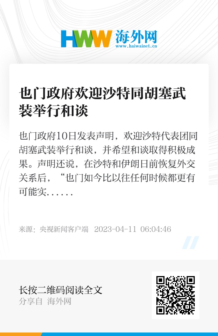 也门政府10日发表声明,欢迎沙特代表团同胡塞武装举行和谈,并希望和谈取得积极成果。声明还说,在沙特和伊朗日前恢复外交关系后,“也门如今比以往任何时候都更有可能实现和平”。
