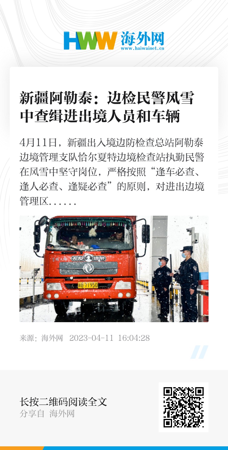 4月11日,新疆出入境边防检查总站阿勒泰边境管理支队恰尔夏特边境检查站执勤民警在风雪中坚守岗位,严格按照“逢车必查、逢人必查、逢疑必查”的原则,对进出边境管理区人员和车辆实行24小时双向查缉机制。图片来源:视觉中国