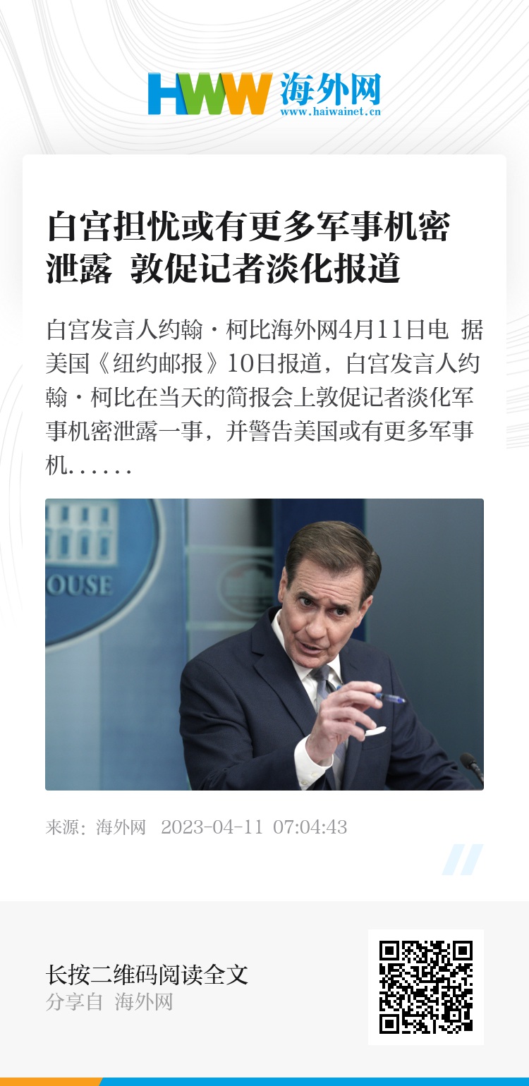 海外网4月11日电 据美国《纽约邮报》10日报道,白宫发言人约翰·柯比在当天的简报会上敦促记者淡化军事机密泄露一事,并警告美国或有更多军事机密被泄露。