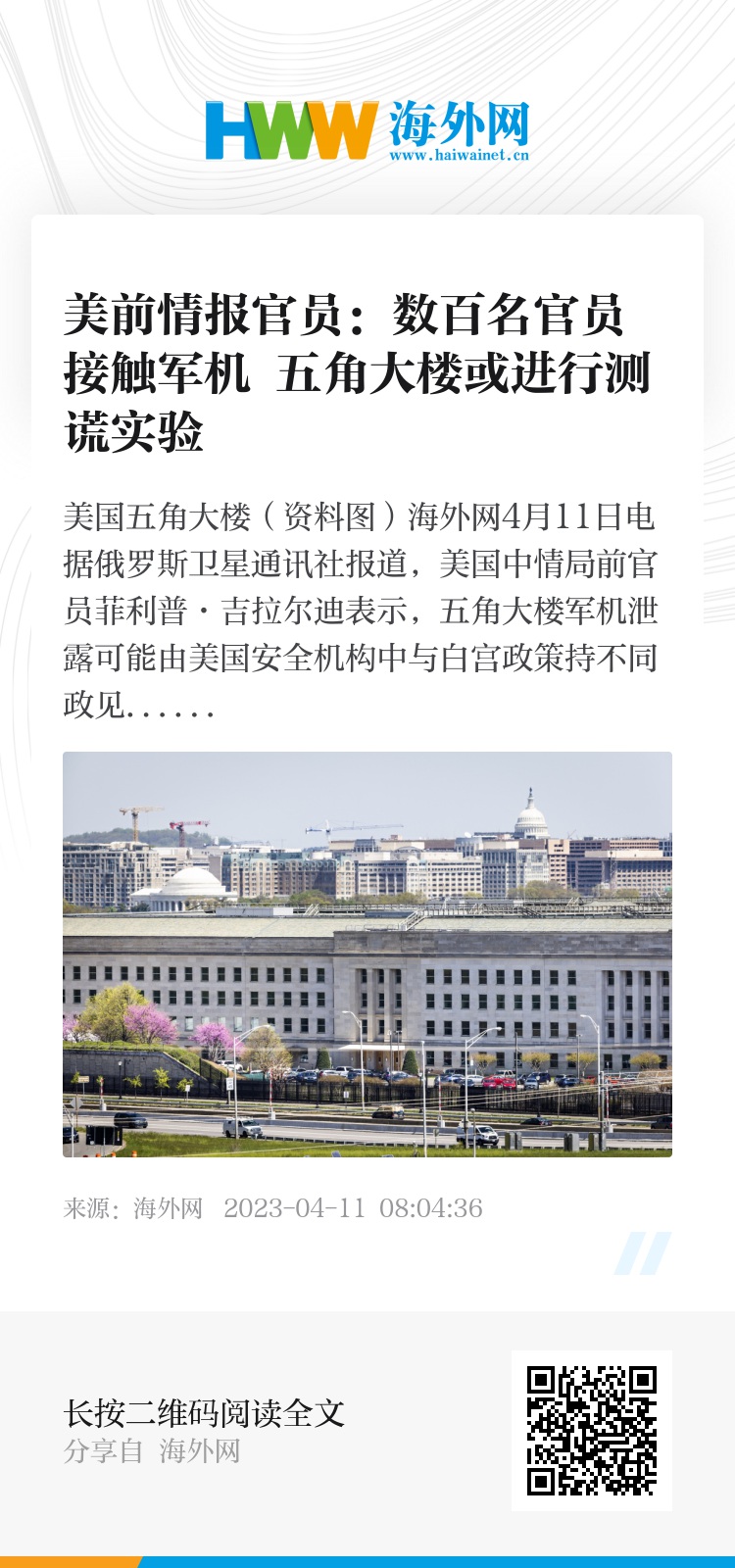 海外网4月11日电 据俄罗斯卫星通讯社报道,美国中情局前官员菲利普·吉拉尔迪表示,五角大楼军机泄露可能由美国安全机构中与白宫政策持不同政见者所为。