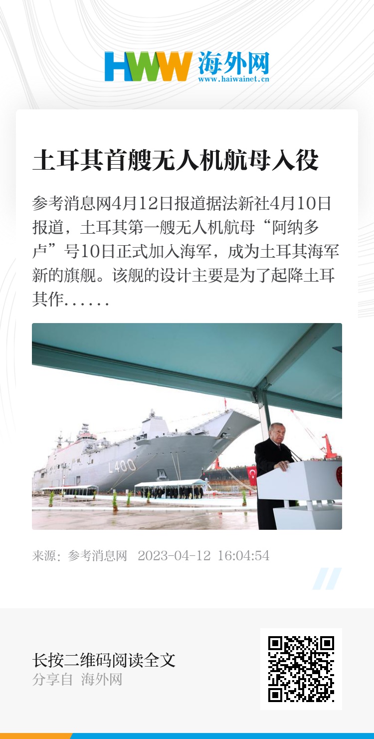参考消息网4月12日报道据法新社4月10日报道,土耳其第一艘无人机航母“阿纳多卢”号10日正式加入海军,成为土耳其海军新的旗舰。该舰的设计主要是为了起降土耳其作战无人机。