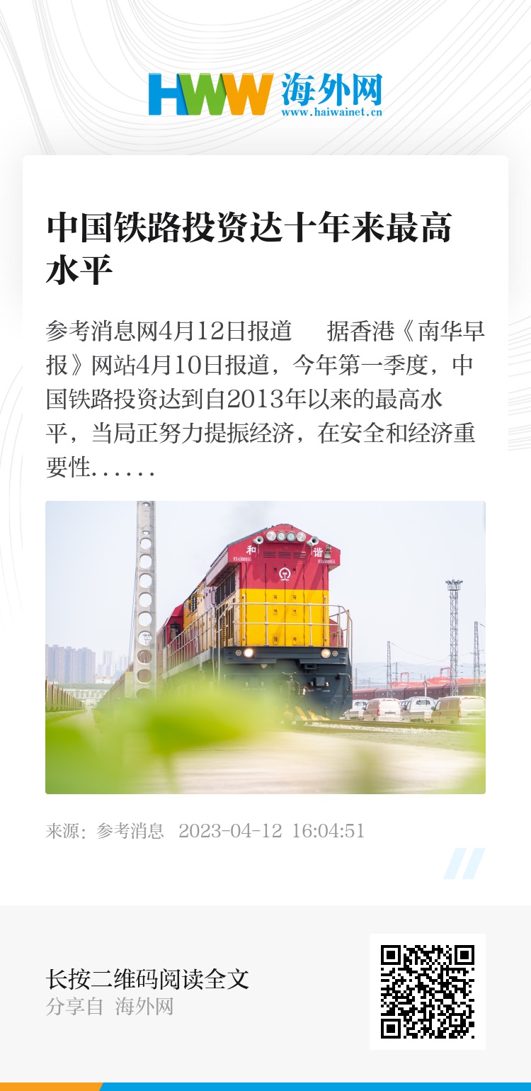 参考消息网4月12日报道 据香港《南华早报》网站4月10日报道,今年第一季度,中国铁路投资达到自2013年以来的最高水平,当局正努力提振经济,在安全和经济重要性日益提升的西部地区加大基础设施建设力度。