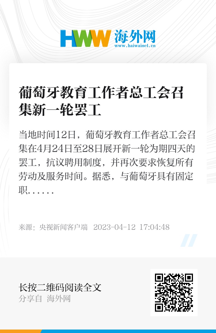 当地时间12日,葡萄牙教育工作者总工会召集在4月24日至28日展开新一轮为期四天的罢工,抗议聘用制度,并再次要求恢复所有劳动及服务时间。据悉,与葡萄牙具有固定职位的教师相比,合同制教师在薪水或资历等方面受到歧视。