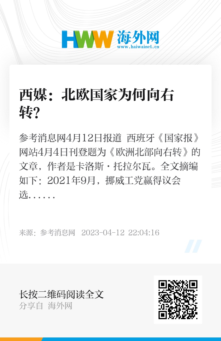 参考消息网4月12日报道 西班牙《国家报》网站4月4日刊登题为《欧洲北部向右转》的文章,作者是卡洛斯·托拉尔瓦。全文摘编如下: