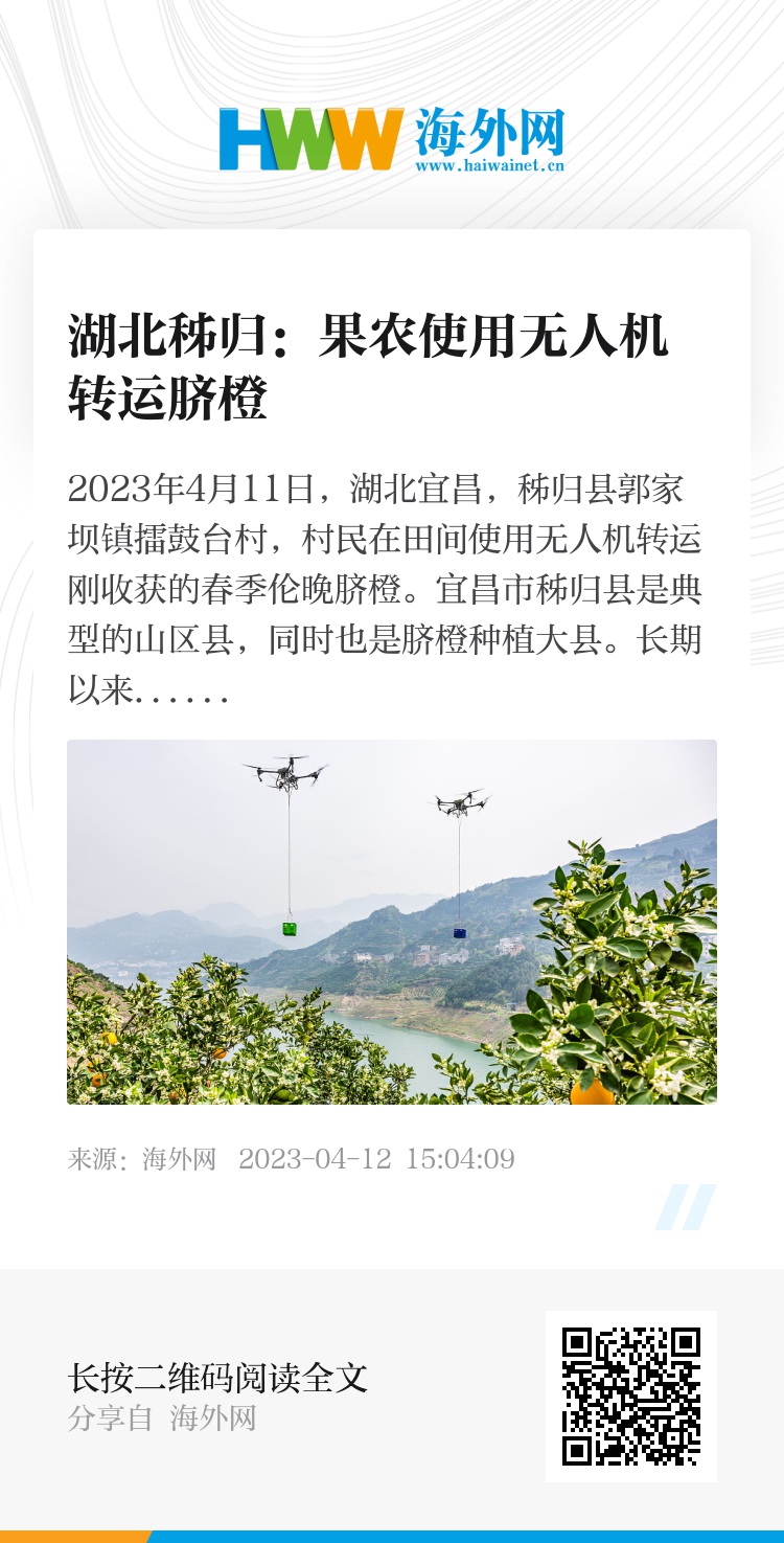 2023年4月11日,湖北宜昌,秭归县郭家坝镇擂鼓台村,村民在田间使用无人机转运刚收获的春季伦晚脐橙。宜昌市秭归县是典型的山区县,同时也是脐橙种植大县。长期以来,从果园到公路主干道的脐橙转运主要靠人力,转运效率低、成本高。今年,该县引进相关企业,组织技术培训,探索使用无人机转运脐橙、化肥,开展植保等,以减少人力成本,提高转运效率。图源:视觉中国