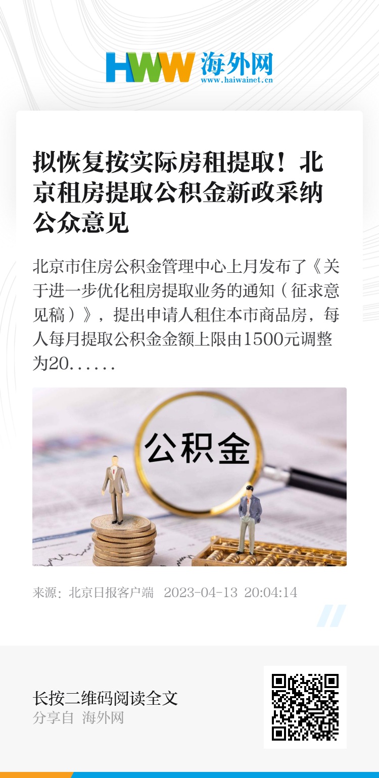 北京市住房公积金管理中心上月发布了《关于进一步优化租房提取业务的通知(征求意见稿)》,提出申请人租住本市商品房,每人每月提取公积金金额上限由1500元调整为2000元。提取金额上限提高后,普通家庭提供发票按实际房租提取的方式被取消。4月13日,记者从北京市住房公积金管理中心获悉,该征求意见稿已结束征集意见,将采纳公众提出的建议,拟恢复上述提取方式。