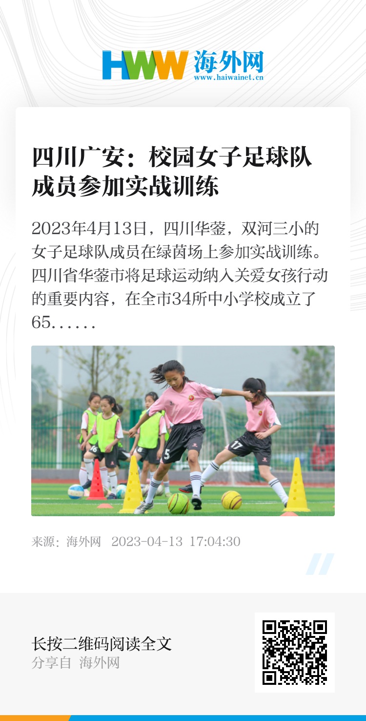2023年4月13日,四川华蓥,双河三小的女子足球队成员在绿茵场上参加实战训练。四川省华蓥市将足球运动纳入关爱女孩行动的重要内容,在全市34所中小学校成立了65支共计1000余名运动员的女子足球队,每年举行一次全市性的校园足球决赛,让女孩享受足球带来的快乐,提高身体素质和运动技能。图片来源:视觉中国