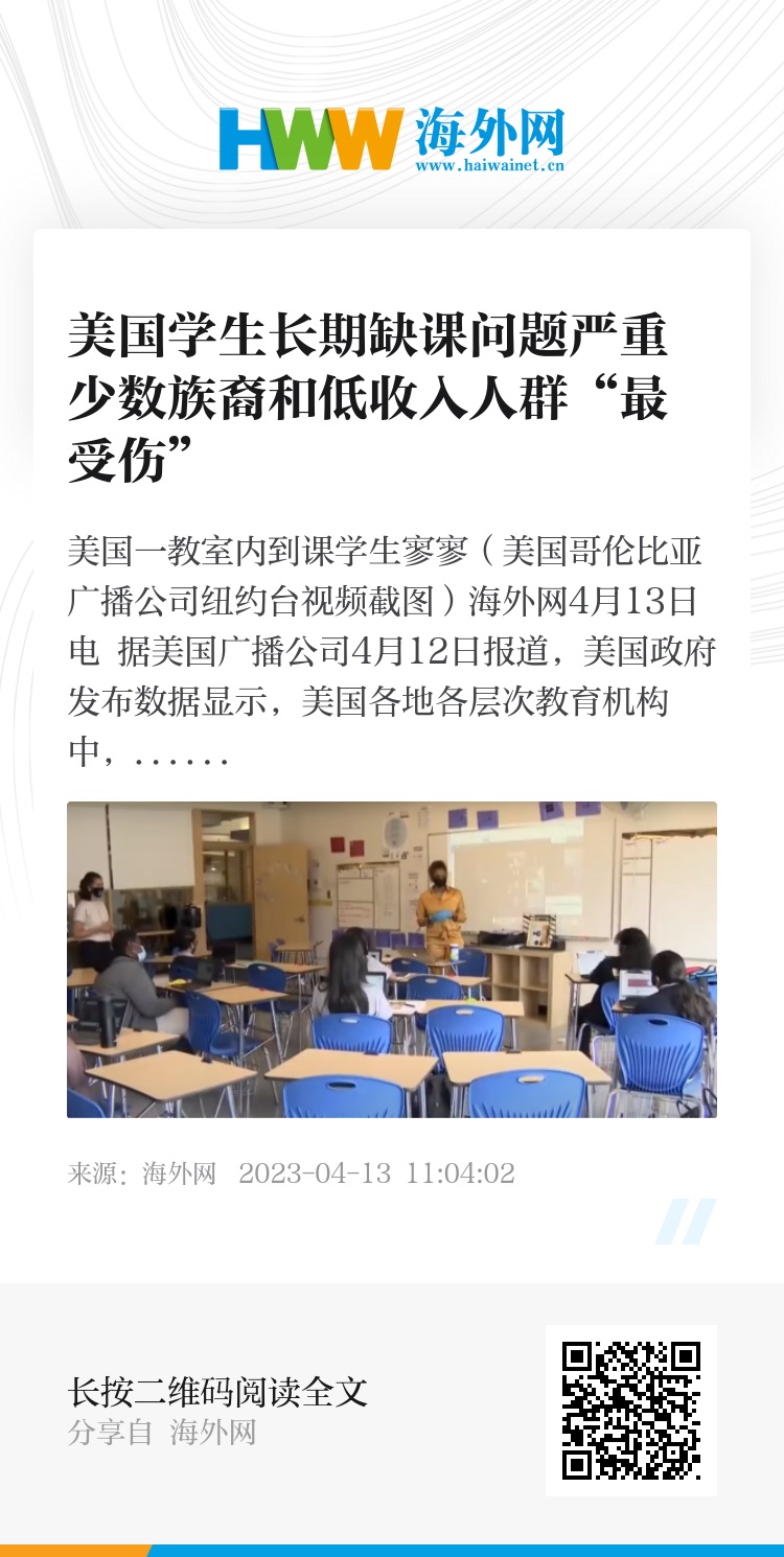 海外网4月13日电 据美国广播公司4月12日报道,美国政府发布数据显示,美国各地各层次教育机构中,均存在大量学生长期缺课现象,缺课问题在少数族裔和低收入家庭学生中尤为多见。