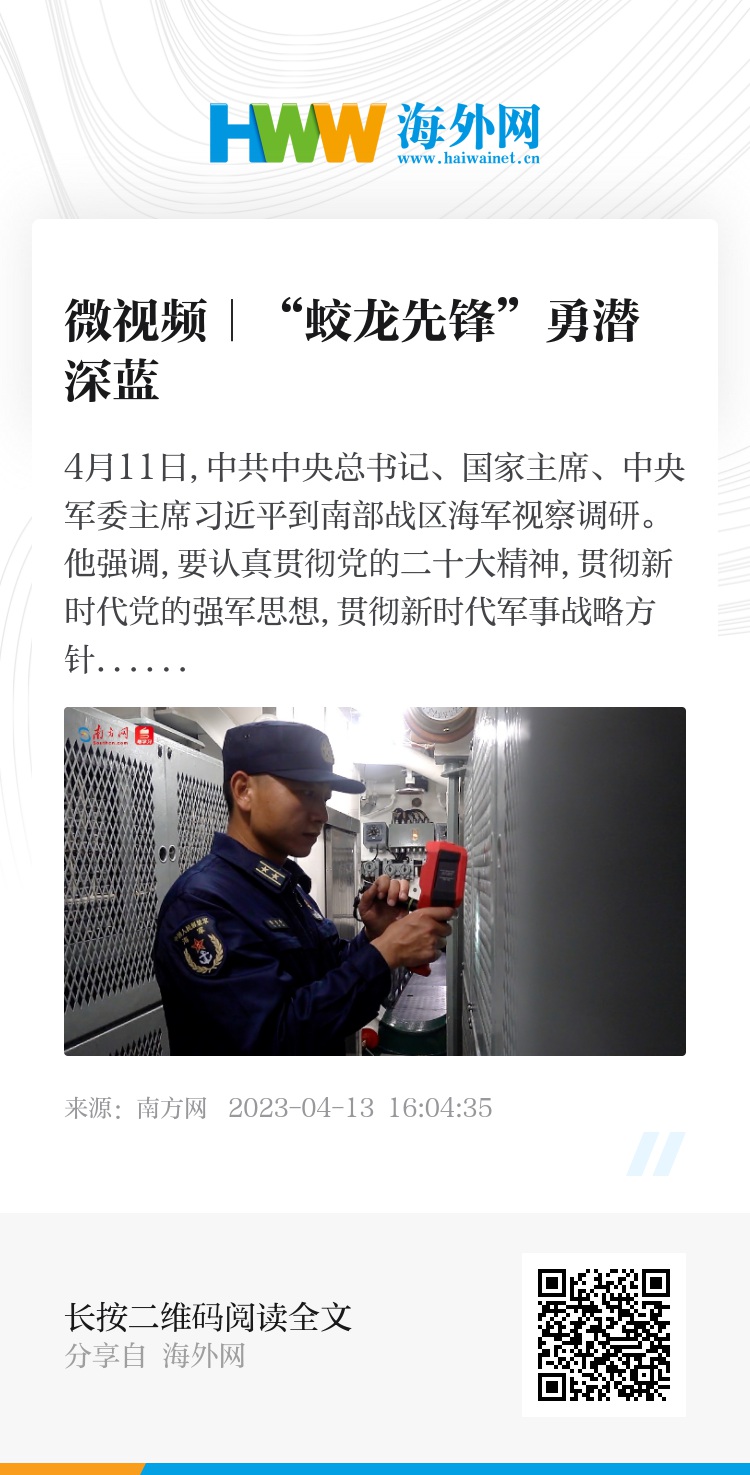 4月11日,中共中央总书记、国家主席、中央军委主席习近平到南部战区海军视察调研。他强调,要认真贯彻党的二十大精神,贯彻新时代党的强军思想,贯彻新时代军事战略方针,深化练兵备战,加快转型建设,全面提高部队现代化水平,坚决完成党和人民赋予的各项任务。