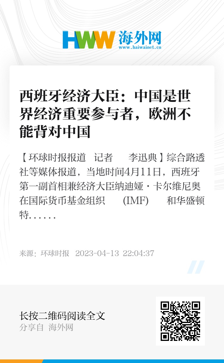 【环球时报报道 记者 李迅典】综合路透社等媒体报道,当地时间4月11日,西班牙第一副首相兼经济大臣纳迪娅·卡尔维尼奥在国际货币基金组织 (IMF) 和华盛顿特区组织的“大西洋理事会”活动中表示,欧洲包括西班牙重视与美国的关系,但绝不能忽视中国。“我们不能背对中国或试图忽视它,中国是重要的贸易伙伴,也是世界经济的重要参与者。”卡尔维尼奥强调。