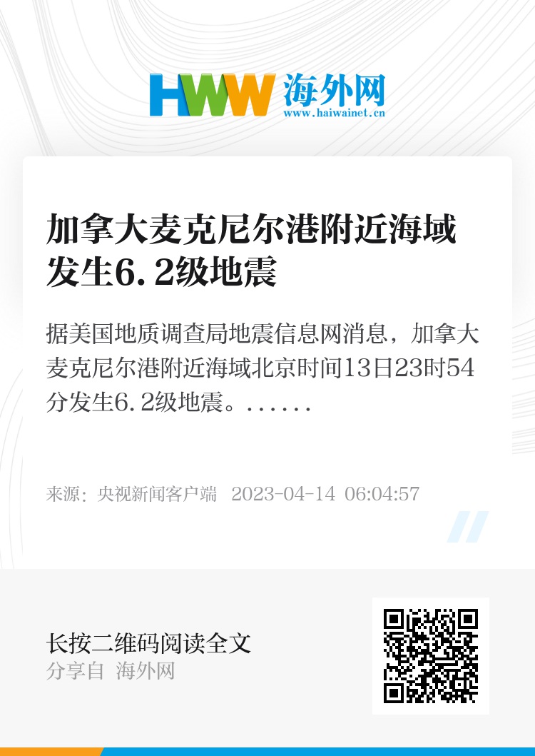 据美国地质调查局地震信息网消息,加拿大麦克尼尔港附近海域北京时间13日23时54分发生6.2级地震。