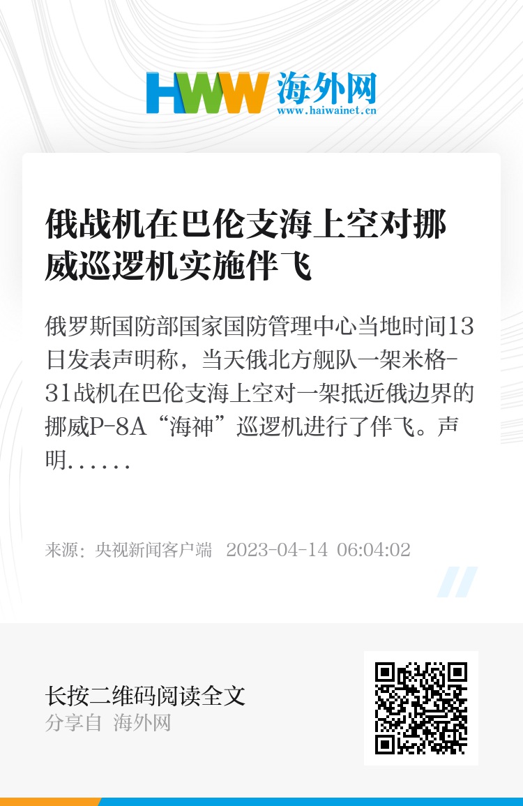 声明表示,当天早些时候,俄空域监控设备在巴伦支海水域上空发现一个空中目标正在向俄边界靠近。俄北方舰队防空部队执勤的一架米格-31战机随即升空,对目标进行识别,防止其侵犯俄边界。经确认,空中目标为挪威空军的P-8A“海神”巡逻机。俄战机在巴伦支海水域上空进行了伴飞。