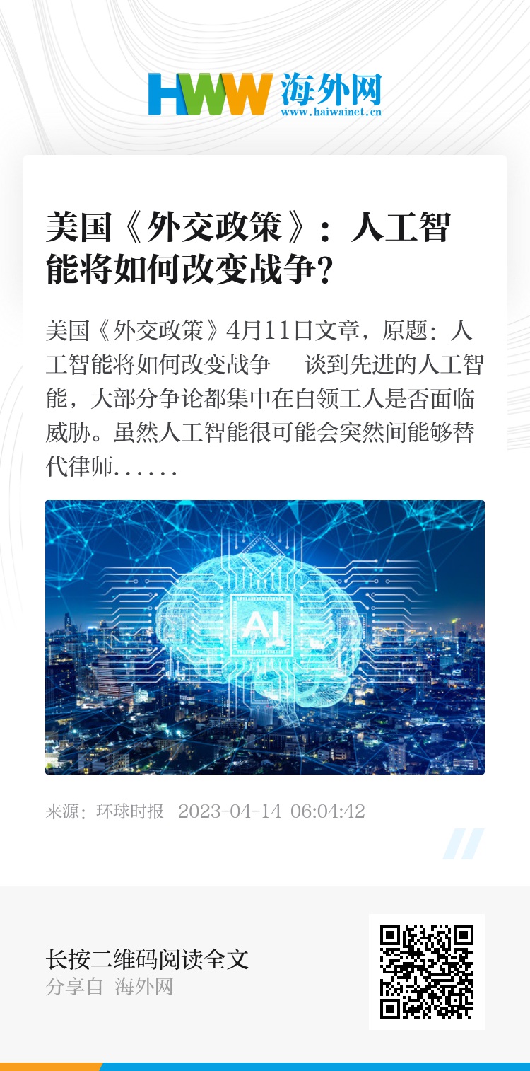 美国《外交政策》4月11日文章,原题:人工智能将如何改变战争 谈到先进的人工智能,大部分争论都集中在白领工人是否面临威胁。虽然人工智能很可能会突然间能够替代律师、会计师、教师、程序员以及记者所做的大部分工作,但这些可能不是发生最大变革的领域。最新的人工智能可能会彻底改变战争,它的作用不一定令人欣慰,甚至可能是致命的。