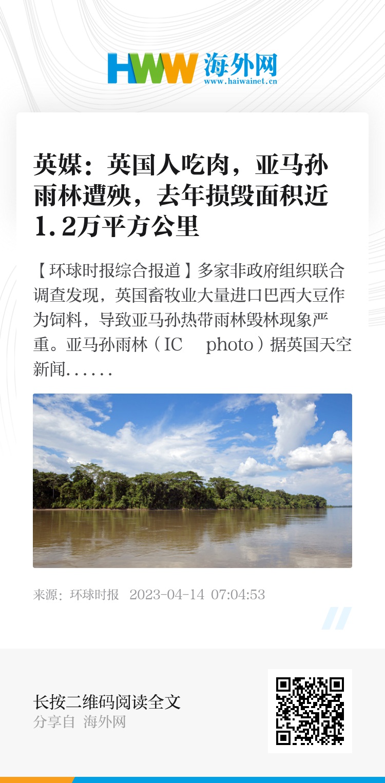 【环球时报综合报道】多家非政府组织联合调查发现,英国畜牧业大量进口巴西大豆作为饲料,导致亚马孙热带雨林毁林现象严重。