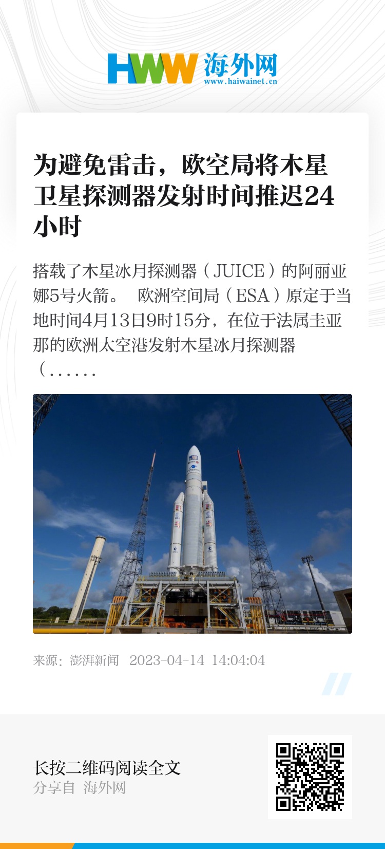 欧洲空间局(ESA)原定于当地时间4月13日9时15分,在位于法属圭亚那的欧洲太空港发射木星冰月探测器(JUICE)。不过,由于监测到发射期间有雷电天气,欧洲空间局宣布将发射时间推迟24小时,改于当地时间14日9时15分发射。
