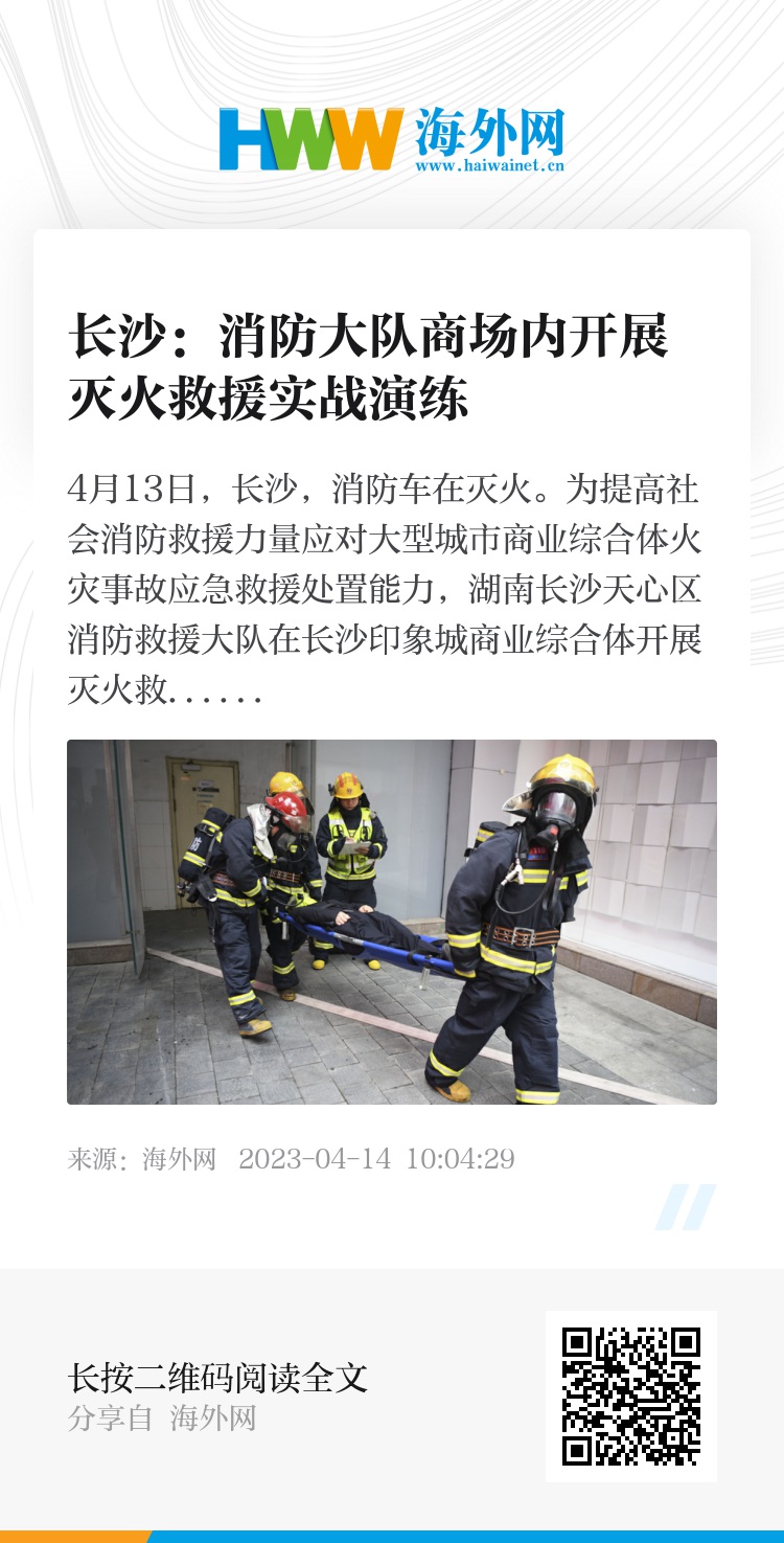 4月13日,长沙,消防车在灭火。为提高社会消防救援力量应对大型城市商业综合体火灾事故应急救援处置能力,湖南长沙天心区消防救援大队在长沙印象城商业综合体开展灭火救援实战演练。图片来源:杨华峰(湖南分社)/中新社/视觉中国