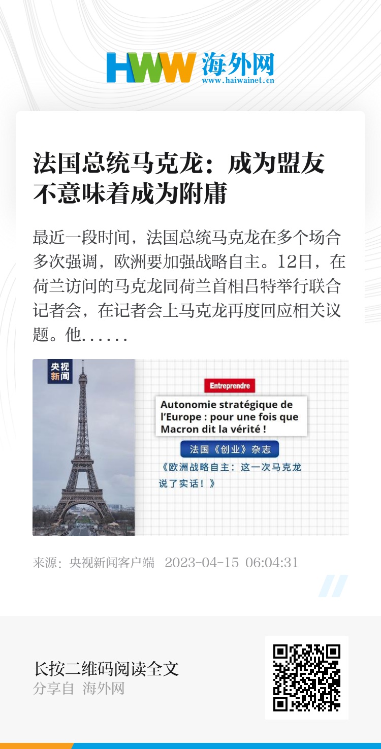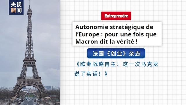 “欧洲战略自主:马克龙说了实话!”法国《创业》杂志13日以此为题发表评论文章称,几个月来,法国的媒体和政客一直就俄乌冲突发表好战演说,刻意忽视这场冲突已经拖垮欧洲经济的事实。因此,马克龙希望在好战氛围和阵营对抗的逻辑之外寻求另一条道路是完全正确的做法。