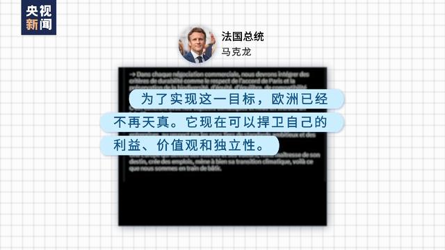 12日,马克龙还在其社交媒体账号发表长文,称“经济主权是我们的目标”,他分别谈到欧洲单一市场的优势、欧洲产业政策的推进和投资半导体行业的重要性等内容。马克龙写道,“为了实现这一目标,欧洲已经不再天真。它现在可以捍卫自己的利益、价值观和独立性”。