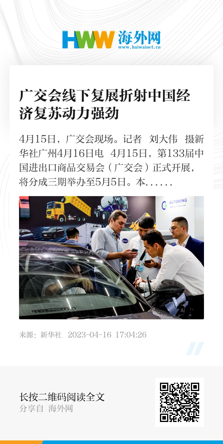 新华社广州4月16日电 4月15日,第133届中国进出口商品交易会(广交会)正式开展,将分成三期举办至5月5日。本届广交会是新冠疫情以来第一次全面线下举办,展览面积、参展企业数量均创历史新高,吸引了220多个国家和地区的数十万采购商报名参会。