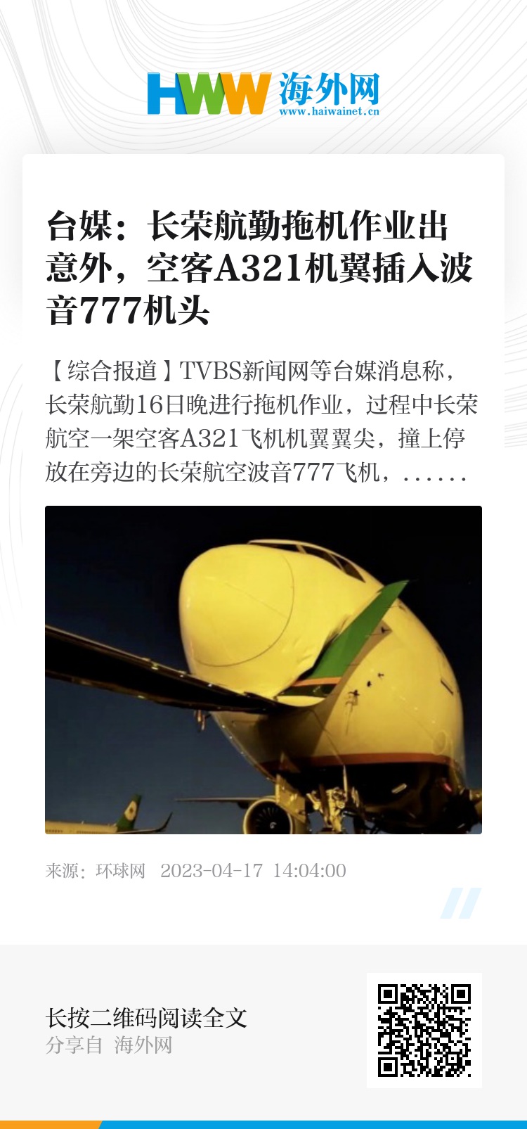 【环球网综合报道】TVBS新闻网等台媒消息称,长荣航勤16日晚进行拖机作业,过程中长荣航空一架空客A321飞机机翼翼尖,撞上停放在旁边的长荣航空波音777飞机,翼尖直接插入机头下方。长荣航空已证实此事。