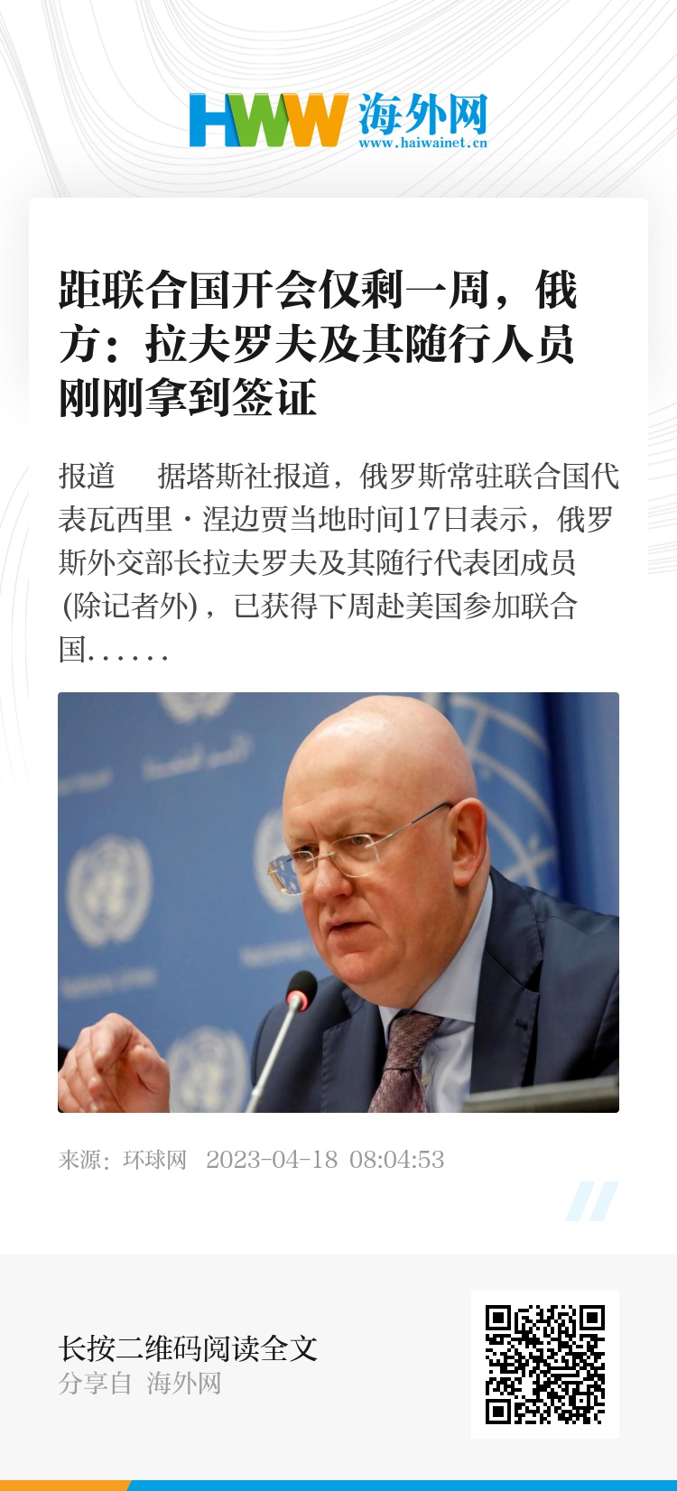 塔斯社称,俄罗斯本月担任联合国安理会轮值主席国。作为担任轮值主席国的一部分,拉夫罗夫将赴美国纽约参加4月24日和25日举行的联合国安理会会议。但俄罗斯驻美国大使安东诺夫13日在接受俄罗斯电视媒体采访时还表示,拉夫罗夫及其随行人员至今没有收到赴美参会的签证。安东诺夫敦促美国立即发放签证,并指责美方的所作所为是在破坏俄美关系。