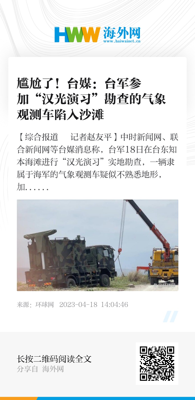 【环球网综合报道 记者赵友平】中时新闻网、联合新闻网等台媒消息称,台军18日在台东知本海滩进行“汉光演习”实地勘查,一辆隶属于海军的气象观测车疑似不熟悉地形,加上车体重达十多吨,整辆车陷入松软的沙滩上动弹不得,几番救援无效,最后紧急找来吊车,不断拉扯顶高,最后才顺利脱困。对此,联合新闻网称“尴尬了!”