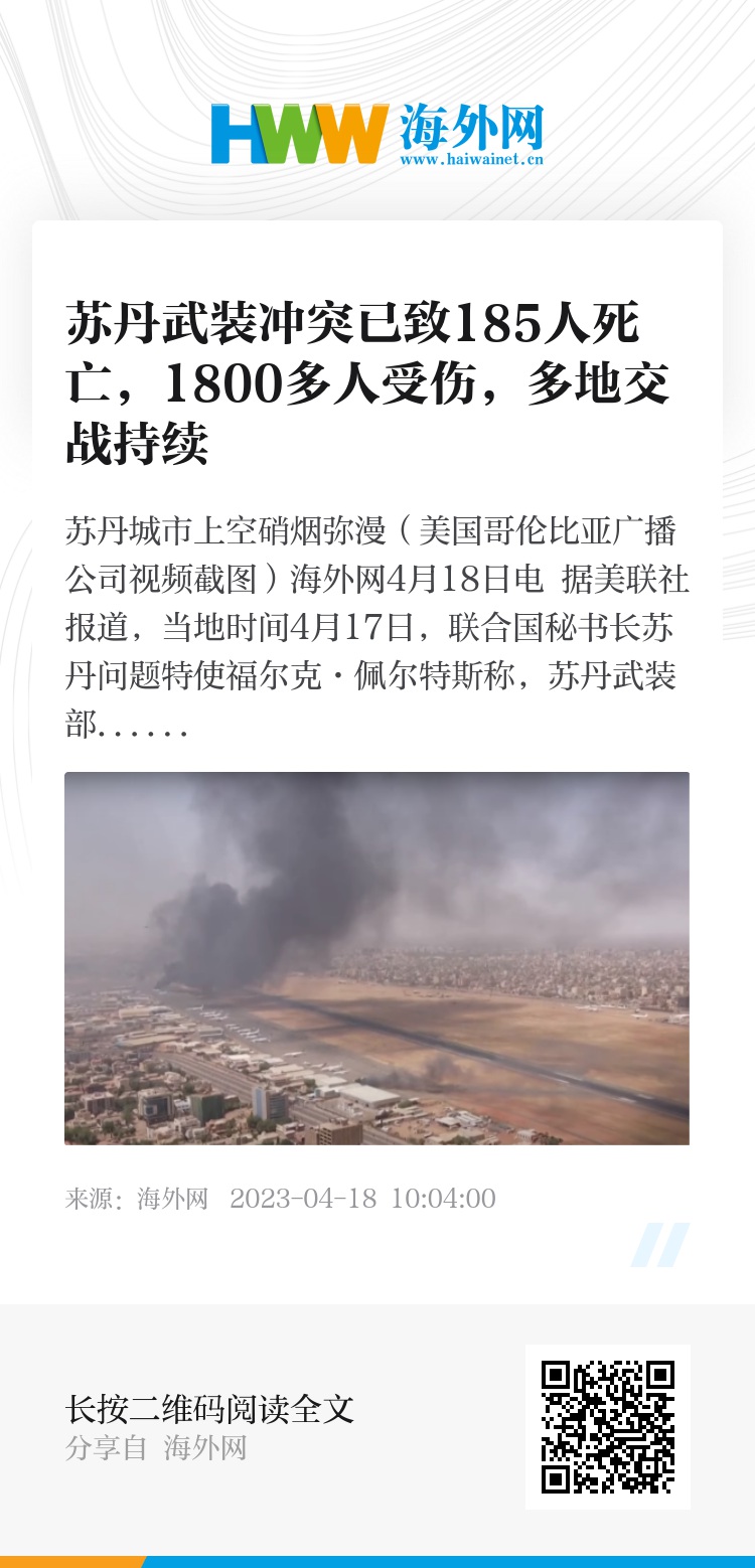 海外网4月18日电 据美联社报道,当地时间4月17日,联合国秘书长苏丹问题特使福尔克·佩尔特斯称,苏丹武装部队和快速支援部队之间的武装冲突已造成185人死亡,1800多人受伤,伤亡遍及全国多个地区。